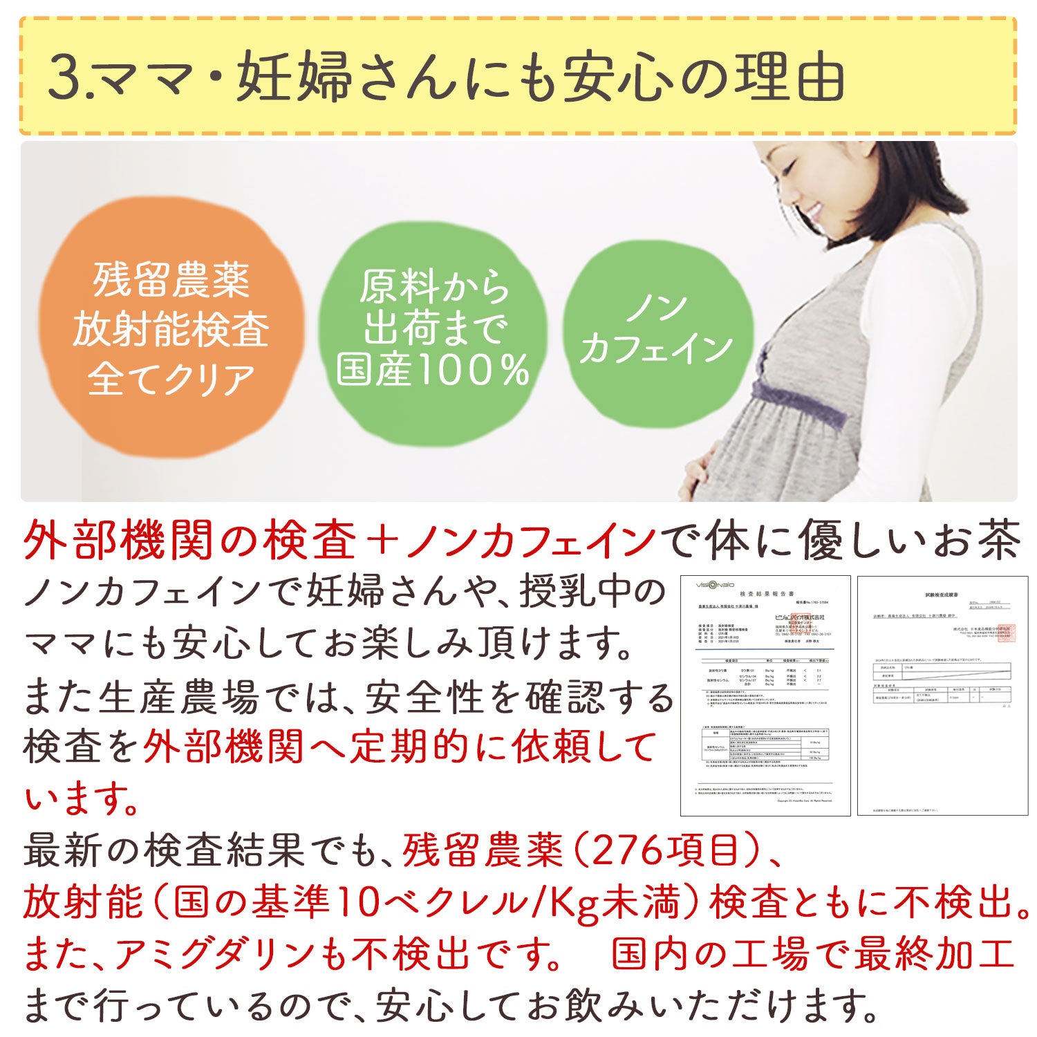 また、お子さんからご高齢の方までが、朝昼夜、いつでもたっぷり飲めるノンカフェインのお茶です。