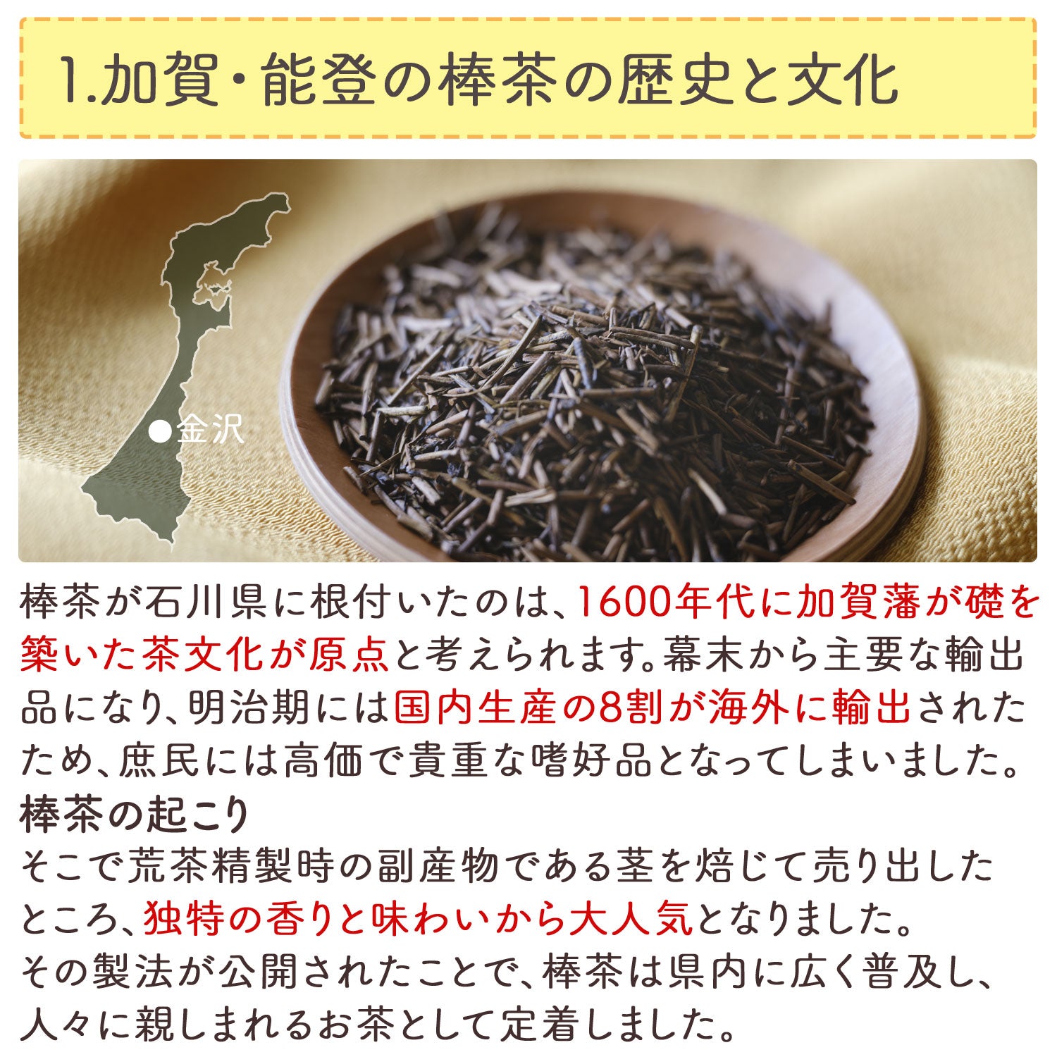 江戸時代「加賀百万石」と言われ栄えた加賀藩で親しまれ、今もなお石川県内ではお茶と言えば棒ほうじ茶と言われ、県内には多くの伝統のほうじ職人が鏑を削る。