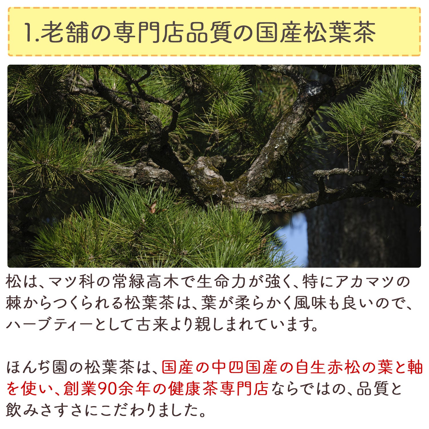 ほんぢ園の松葉茶は、国産の中四国産の自生赤松の葉と軸を使い、創業90余年の健康茶専門店ならではの、品質と飲みさすさにこだわりました。