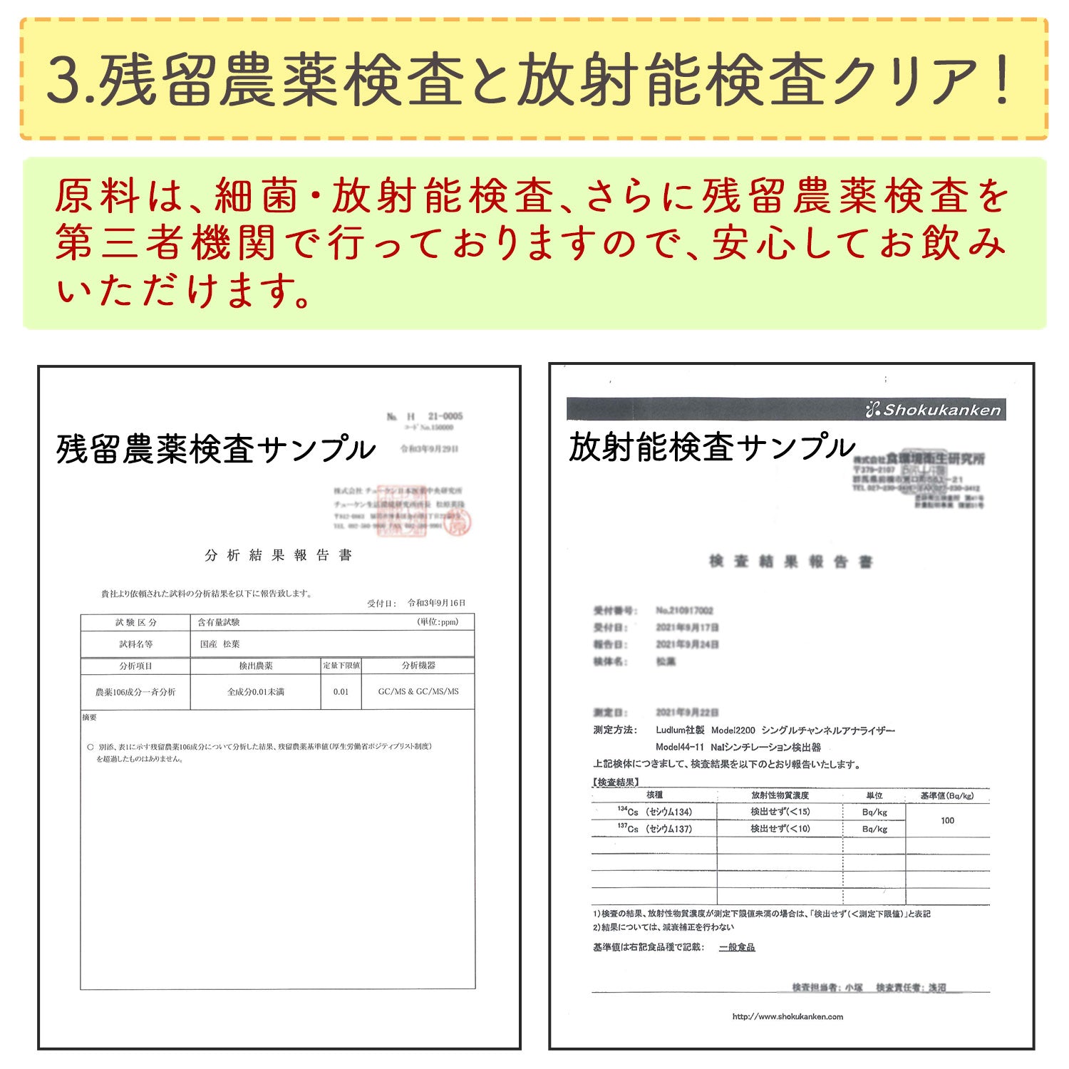 また、原料は、細菌・放射能検査、さらに残留農薬検査を第三者機関で行っておりますので、安心してお飲みいただけます。
