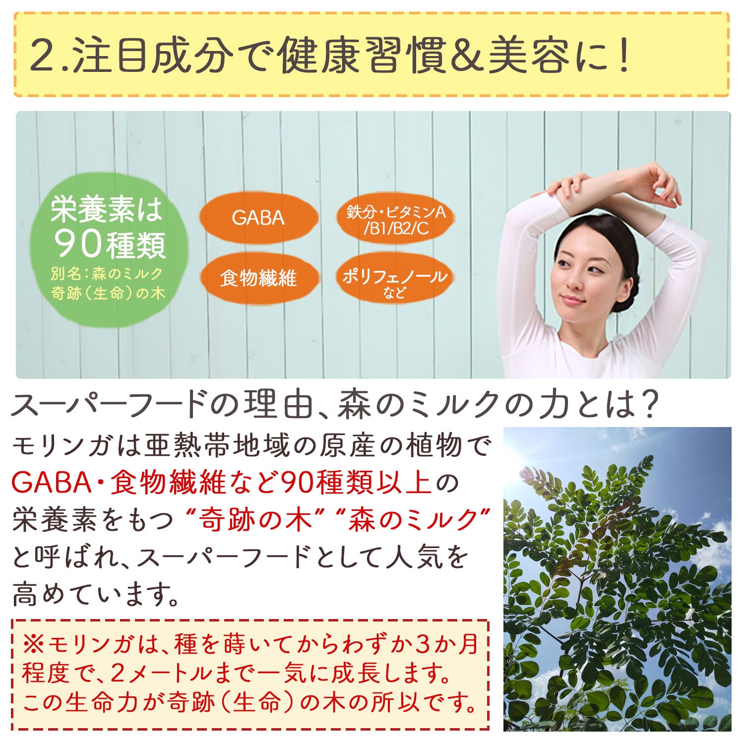 モリンガは亜熱帯地域の原産の植物で、GABAなど90種類以上の栄養素をもつ“奇跡の木”“森のミルク”と呼ばれスーパーフードとして人気を高めています。