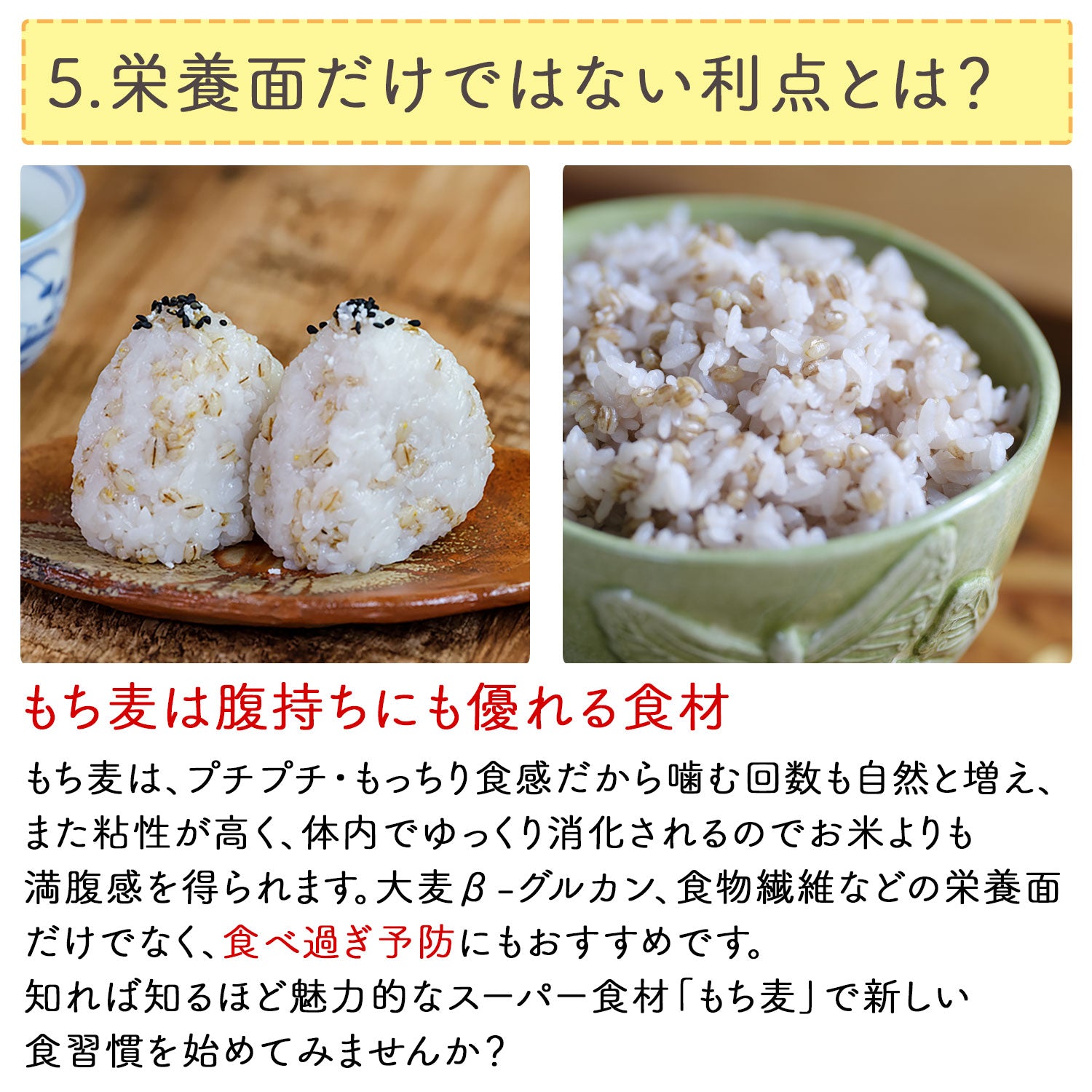 ・もち麦の量を増やすと食物繊維が多くなるため、お腹がゆるくなったり、逆にお腹が張ったり便秘になったりする場合があります。続けると腸内が慣れてきますが、個人差もあるので様子をみながら量を加減してください。