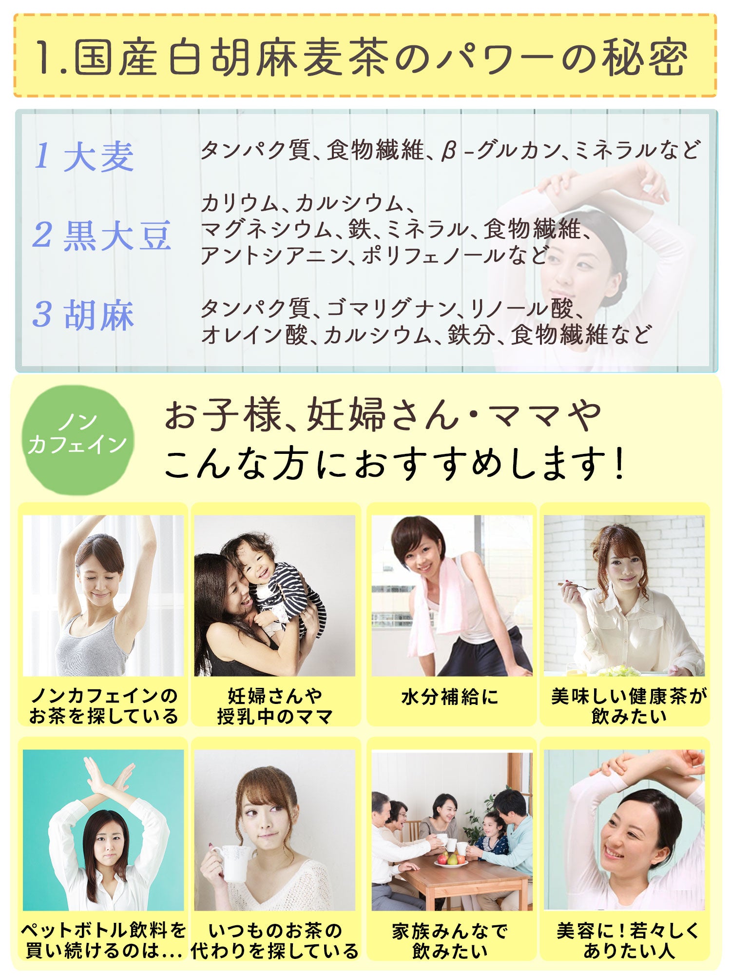 こだわりの国産の大麦・黒大豆(遺伝子組み換えでない)・白胡麻を飲みやすくブレンドした香ばしいお茶です。ノンカフェインなので、妊婦さんやお子様も安心してお飲みいただけます。毎日の健康と美容のサポートにおすすめです。