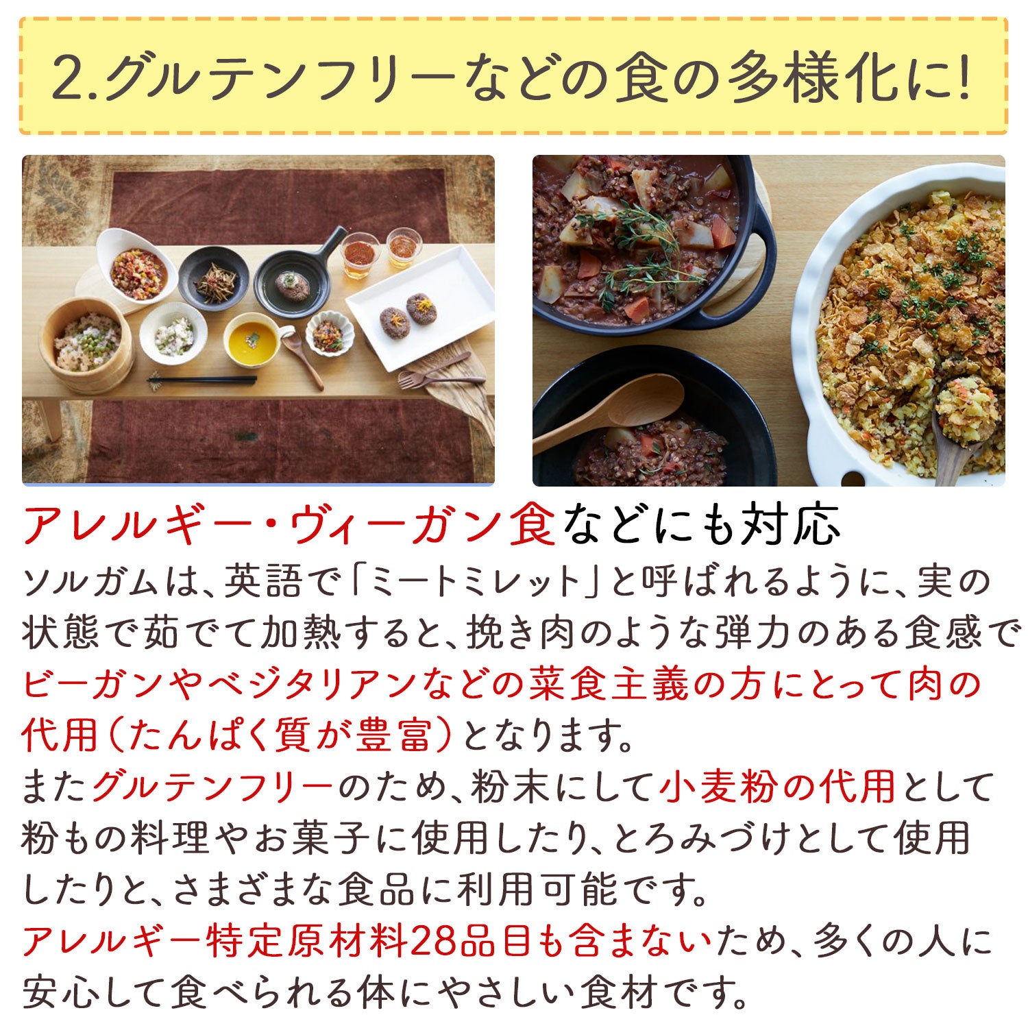 ソルガムは、英語で「ミートミレット」と呼ばれるように、実の状態で茹でて加熱すると、挽き肉のような弾力のある食感で、ビーガンやベジタリアンなどの菜食主義の方にとって肉の代用(たんぱく質が豊富)となります。 またグルテンフリーのため、粉末にして小麦粉の代用として粉もの料理やお菓子に使用したり、とろみづけとして使用したりと、さまざまな食品に利用可能です。アレルギー特定原材料28品目も含まないため、多くの人に安心して食べられる体にやさしい食材です。