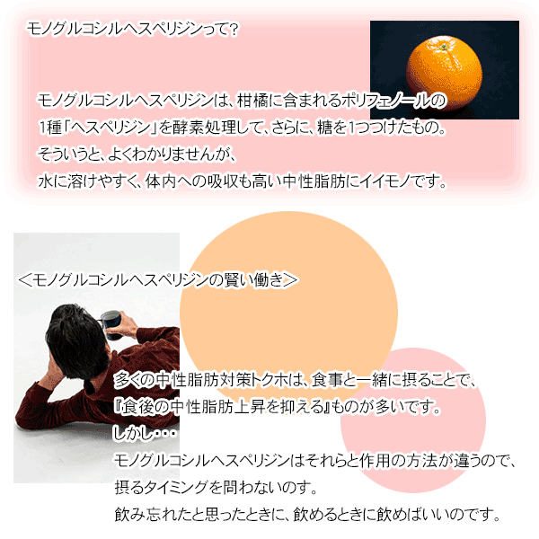 許可表示:本品は、血中中性脂肪を低下させる作用のあるモノグルコシルヘスペリジンを含んでおり、脂肪の多い食事を摂りがちな方、血中中性脂肪が高めの方に適しています。